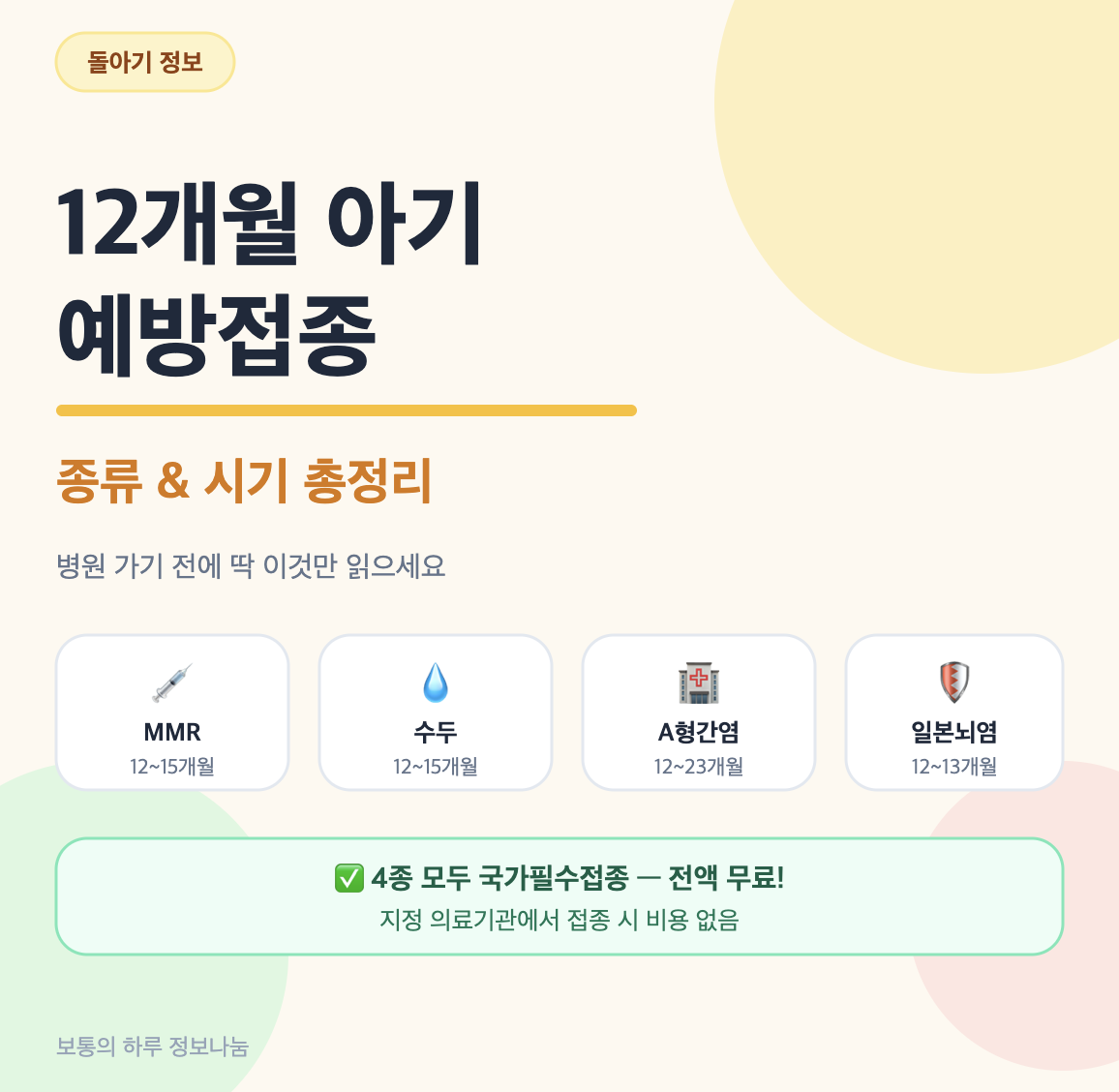 - 12개월 핵심 접종 : MMR·수두·A형간염·일본뇌염
